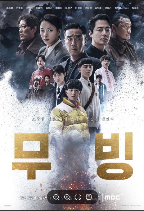 드라마 '무빙'은 2023년 8월 9일부터 2023년 9월 20일까지 방영된 디즈니+금요 드라마다. 기획의도 초능력을 숨긴 채 현재를 살아가는 아이들과 과거의 아픈 비밀을 숨긴 채 살아온 부모들이 시대와 세대를 넘어 닥치는 거대한 위험에 함께 맞서는 초능력 액션 히어로물 드라마이다.