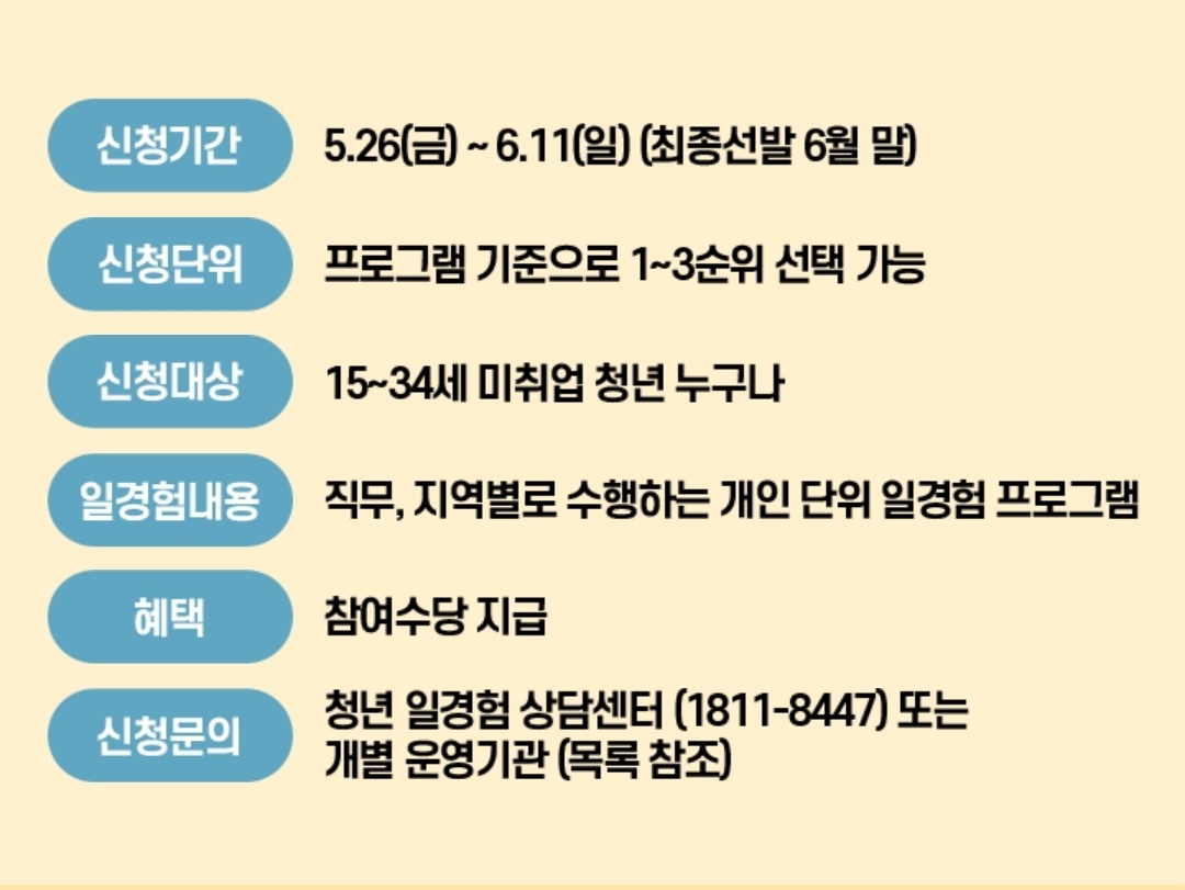 최근 채용트렌드는 학벌이나 스펙보다는 실제 일을 잘할 수 있는 직무역량을 더 중요시하고 있습니다. 하지만 젊은 세대들은 일자리를 구하기도 어려운데, 일 경험을 쌓기는 더 어려운 것이 현실입니다. 간단히 말하면, 인턴십 등의 프로그램을 제공하는 것인데, 그 유형이 기업탐방형, 프로젝트형, 인턴형, 자율공모형이 있습니다. 내일(2023. 5. 26)부터 6.11일까지 신청을 받고 6월 말 최종 선정할 예정이라고 합니다. 바로 내일부터 신청이 시작되는 것은 인턴형과 프로젝트형입니다. 대규모로 모집할 예정이고, 미취업 청년이라면 소득, 지역 상관없이 누구나 신청할 수 있으니 자세히 알아보시고 나에게 맞는 제도라면 참여해 보시면 좋을 것 같습니다.